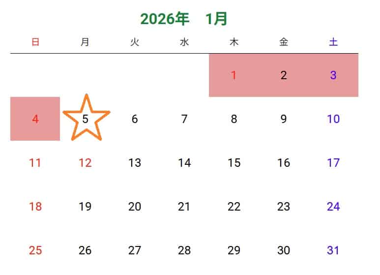 通常だと正月三が日明けが最初の開庁日となりますが、今年は4日が日曜日のため2026年1月5日(月)~の開庁となります。